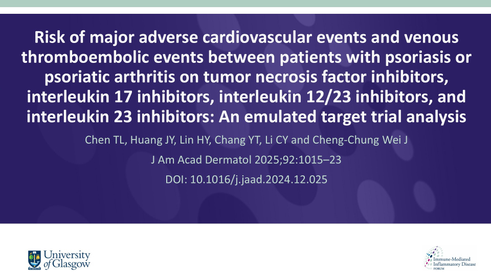 Chen et al. investigated the risk of MACE and VTE among patients with biologic-naïve psoriasis or PsA receiving biologic therapy. No significant difference in the risks of MACE and VTE was found between new biologics (IL-17i, IL-12/23i, or IL-23i) and TNFi.